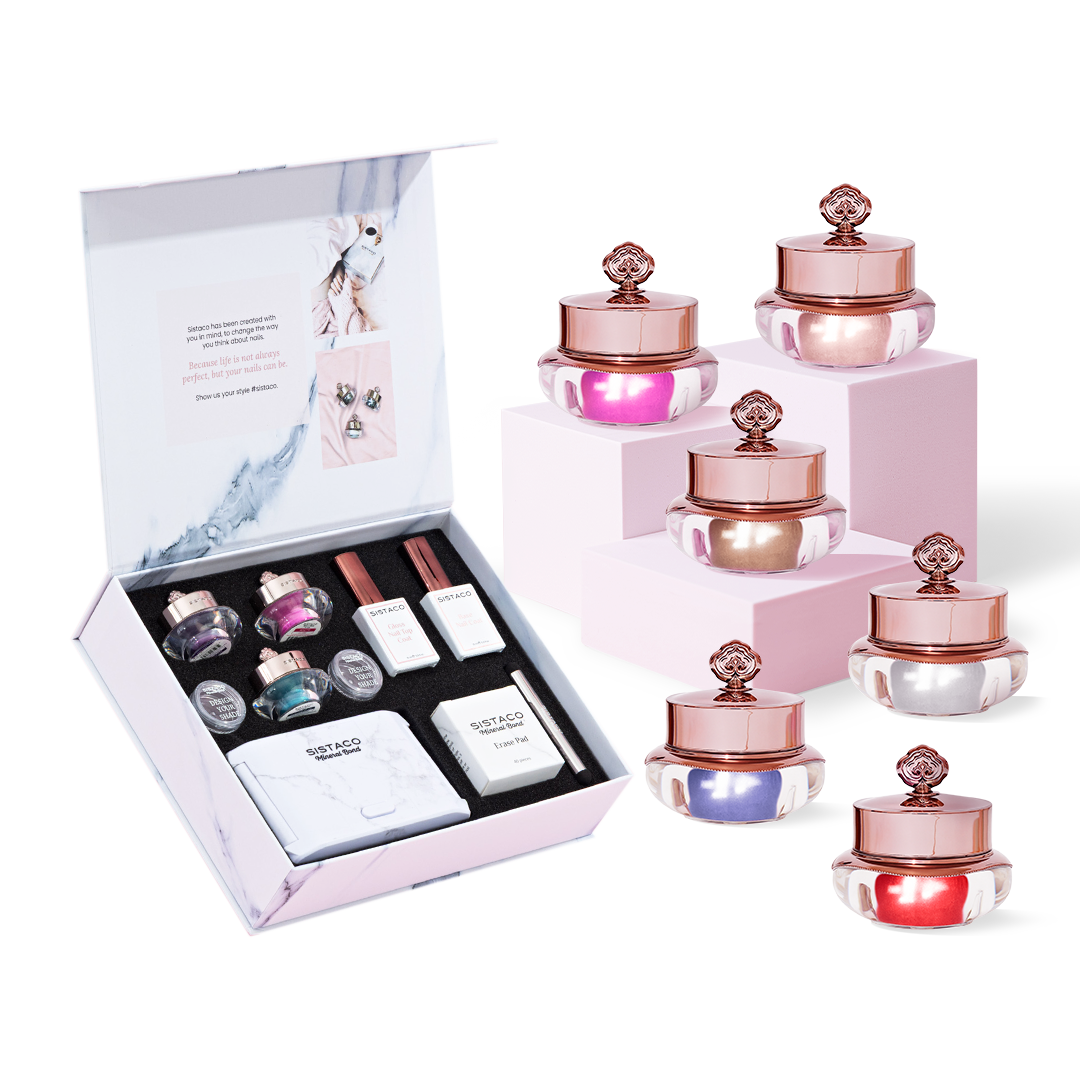 Each set is tailored depending on how many colours you want (You’ll always come back for more!). The sets includes either 3 or 6 colors, respectively, along with top and base coats, erase pads, an LED lamp, and a mineral bond applicator.